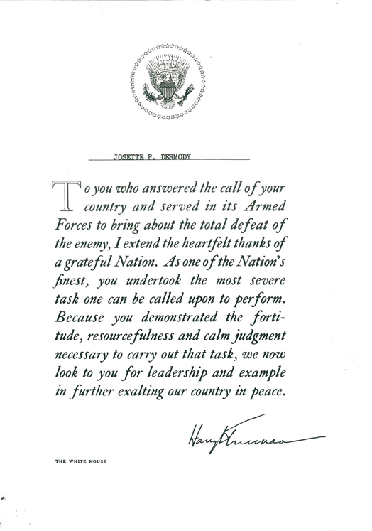 WAVES received this notice from President Harry Truman at the end of their military service.