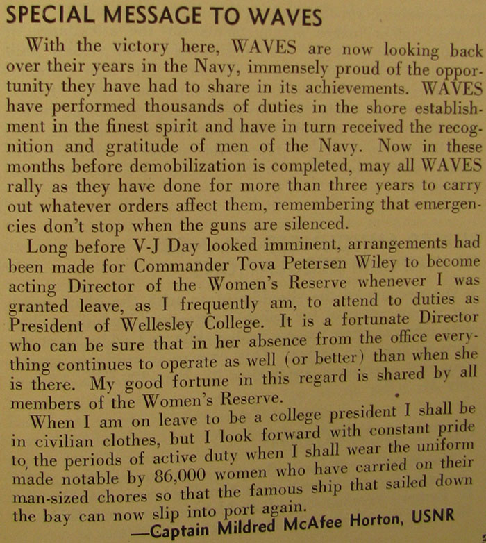 As the war was ending, WAVE leader Mildred McAfee offered this missive to WAVES in mid-1945. It was then that she took a leave of absence to get married (and return to her post at Wellesley College; she would officially resign from the WAVES in 1946.