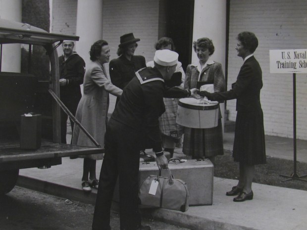 Women arrive at Smith College for their officer’s training. Only four of the women are identified in the photo: Billye Wilde, Bette Evans, Eleanor Rich and Frances Rich. The other woman (partially hidden behind the suitcases) and the two helpful sailors are not identified.