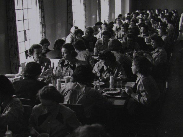 In this photograph from the National Archives, WAVES are having lunch at the mess hall for the Yeoman Training facility in Stillwater at Oklahoma A&M (now Oklahoma State University).