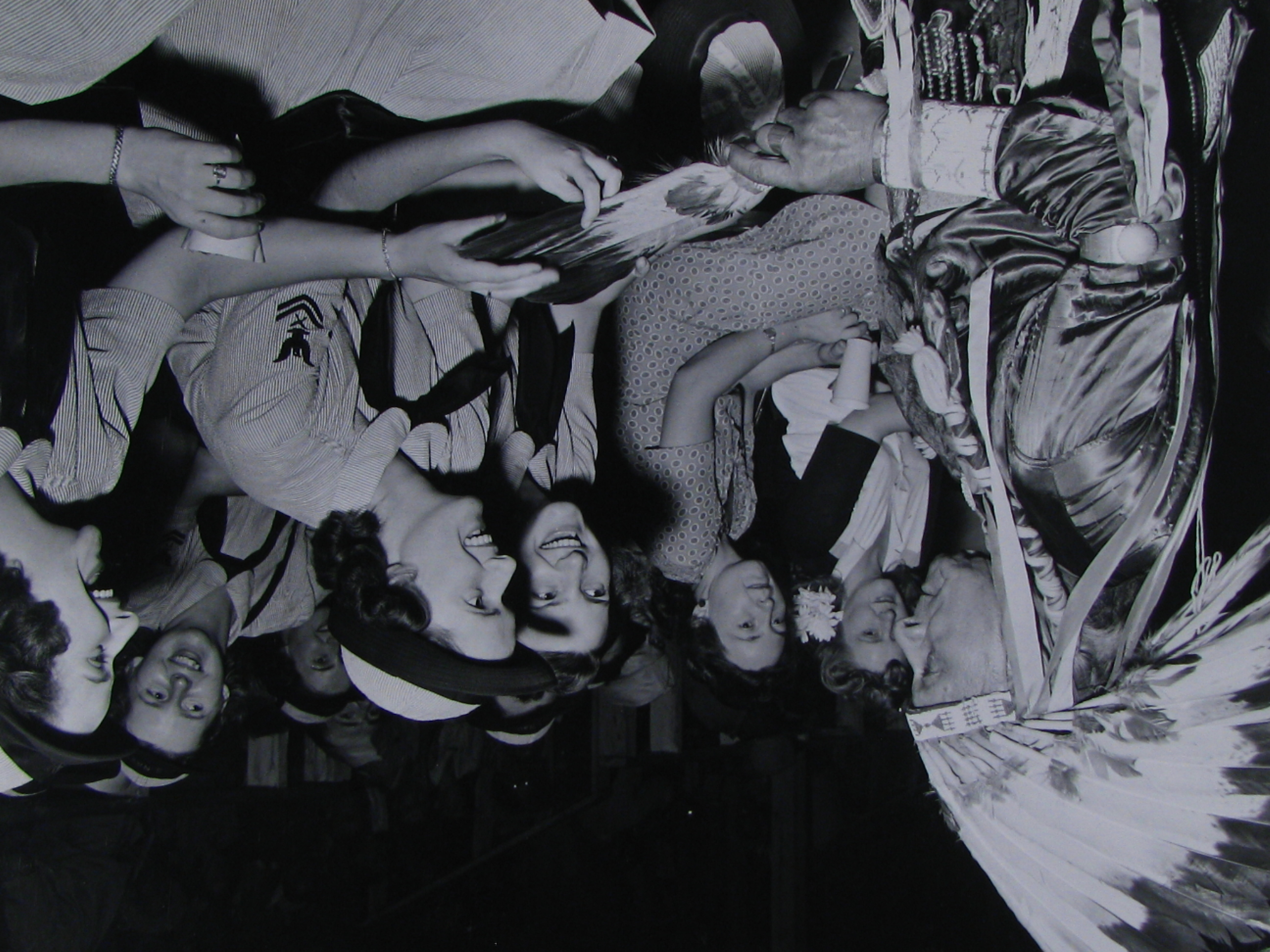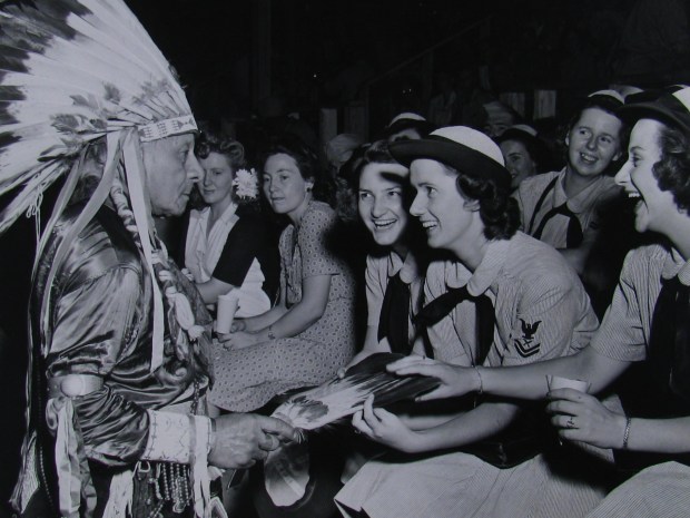 WAVES from NAS, Norman, Oklahoma, were fascinated by the trapping of this real old Indian dancer. His eagle feature fan was minutely examined and appraised. Although he couldn’t speak a word of English, the translator supplied his name. It’s George Washington Daunkia and the WAVES are, left to right: front row, Virginia Low, Yeoman 2nd Class, Rita Eichalbargar, Yeoman 2nd Class, and Betsye Stratton, Yeoman 3rd Class, around from the second row is Ann Skrip, Storekeeper 2nd Class.