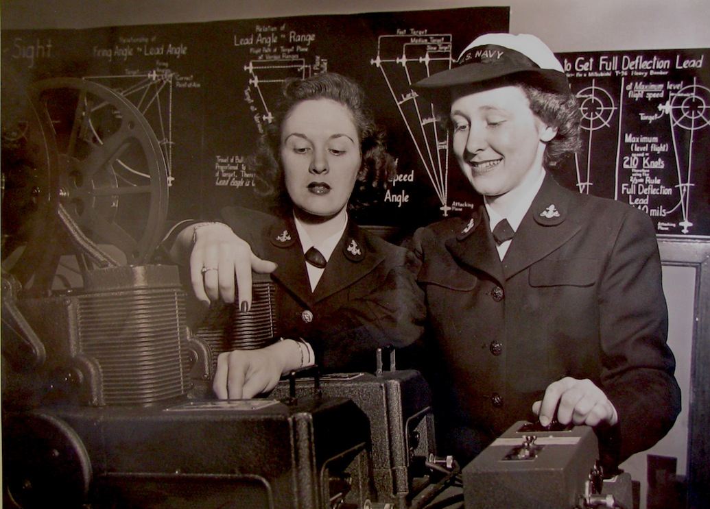 Here two unidentified WAVES are, in the words of the photo caption, “rolling a reel with a purpose.” The reel is for gunnery instruction, as you can see from the instructions on the blackboard behind the WAVES.