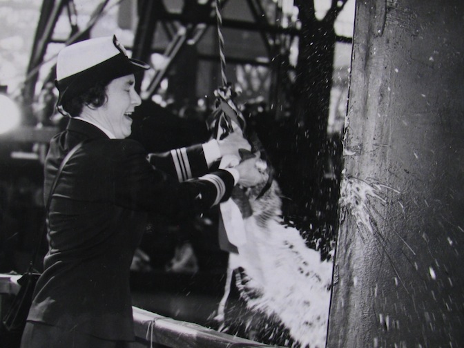 Lt. Cmdr. Mildred H. McAfee, USNR, Director of the Women’s Reserve, christens the USS Franklin at its launching at the Newport News Shipbuilding and Dry dock in October 1943.
