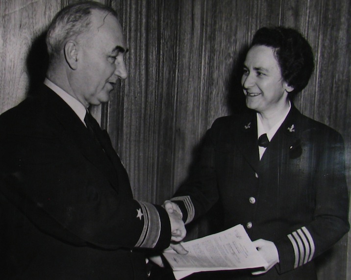 WAVES Director Mildred McAfee is promoted to Captain, November 13, 1943. She’s being congratulated by Rear Admiral Randall Jacobs, Chief of the Navy Bureau of Personnel.