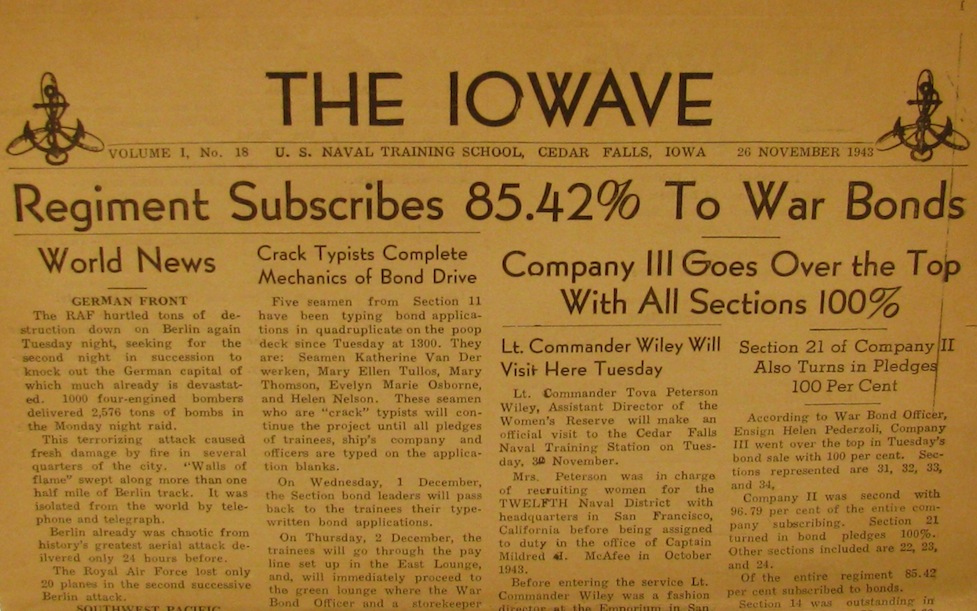 The Iowave from November 26, 1943. Top headline of the day: the impressive support for War Bonds at the Yeoman training school at Iowa State Teacher’s College in Cedar Falls.