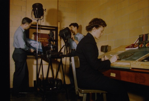 At the photographic lab, Naval Air Station Norfolk, motion picture titles are made in this room where a WAVES artist prepares backgrounds and lettering for shooting by the cameramen at the left.