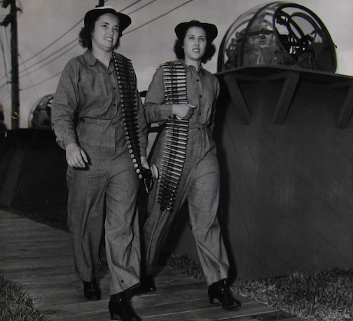 WAVES Florence Johnson and Rosamund Small walk out to the target range at the Naval Air Gunners School in Hollywood, Florida. They were among the first WAVES to qualify as instructors of electrically-operated 50 caliber machine gun turrets in April of 1944.