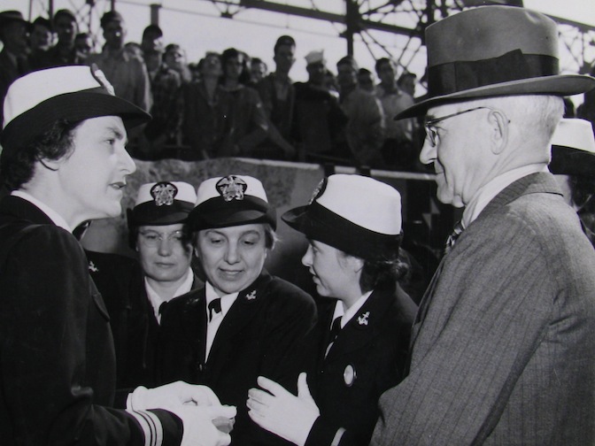 WAVE Ensign Mary McLean steps into the cockpit in flight gear while on duty at NAS Squantum, Massachusetts. Looking on are Lt. Leo J. Houle, the pilot, and Ensign Barbara Hunter. Lt. Houle was a former Flying Tiger pilot on the Chinese front.