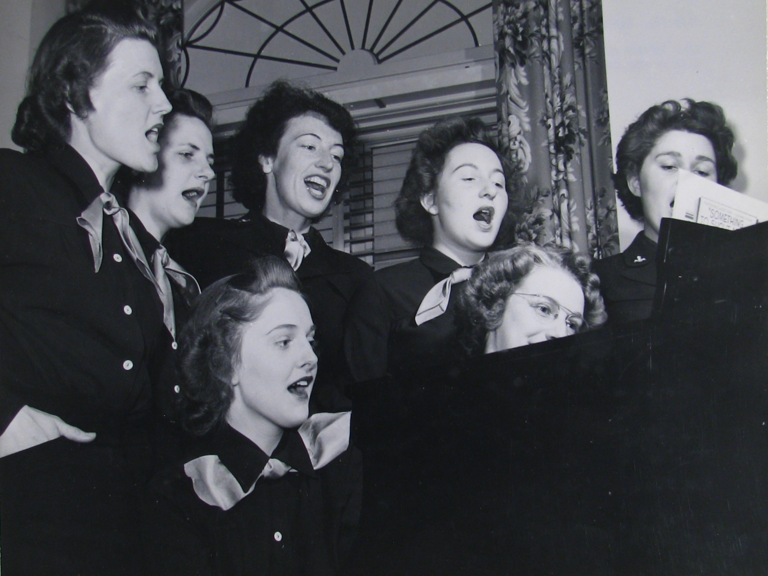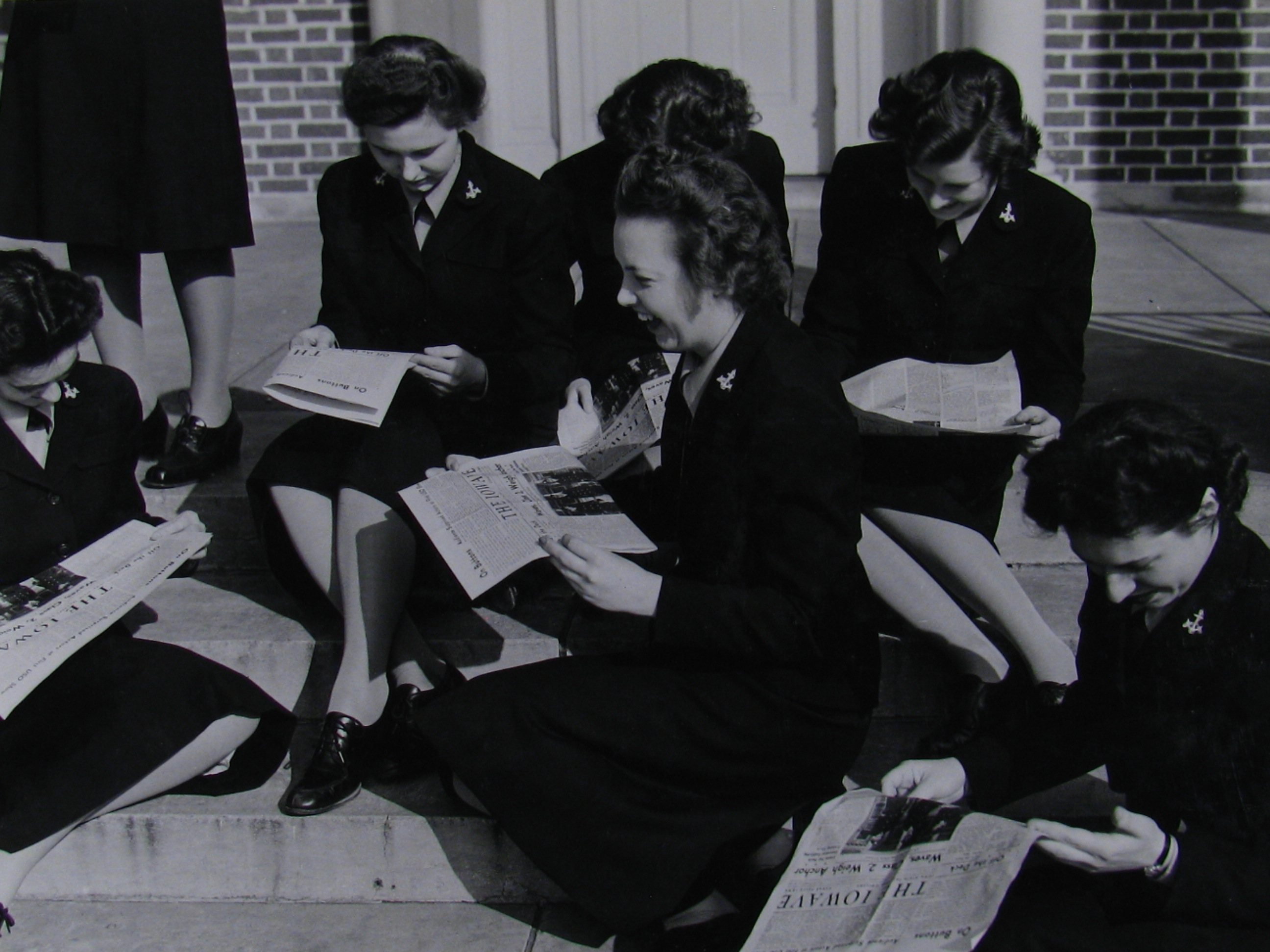 WAVES didn’t just keep in touch with family and friends – they also kept up on the news of the day, including developments in the war, while they were in Boot Camp. Here, WAVES in the Cedar Falls boot camp read newspapers in front of one of their residence halls.