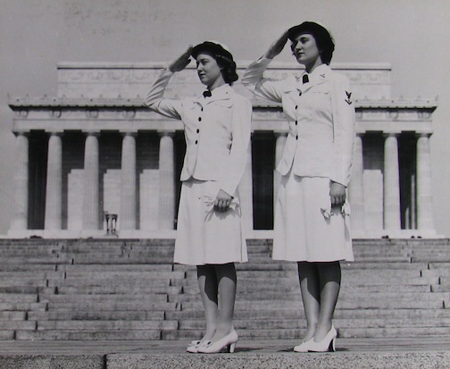 Yesterday we showed you a solo photograph of Patricia Campbell. Here, the WAVE poses with a fellow member of the Women’s Reserve, Mary Lee Graham (on the left) by the Lincoln Memorial.
