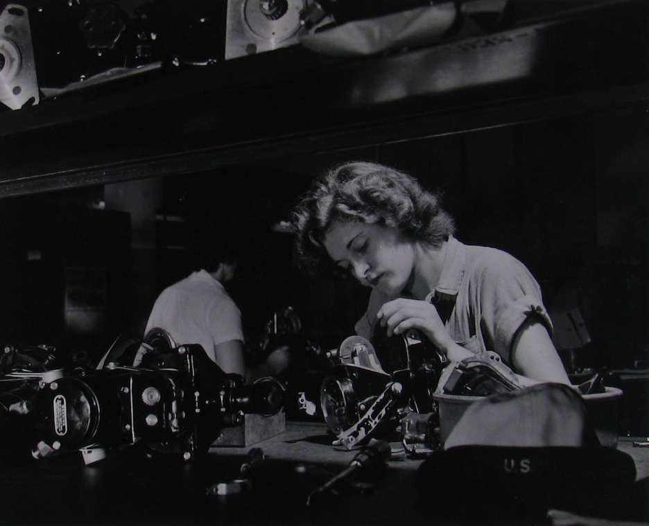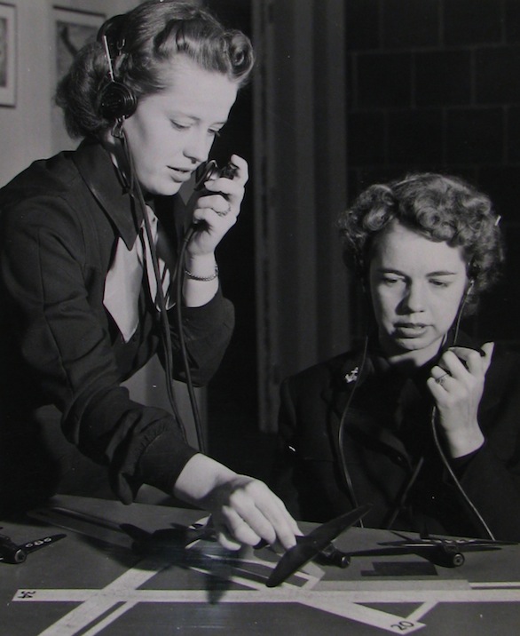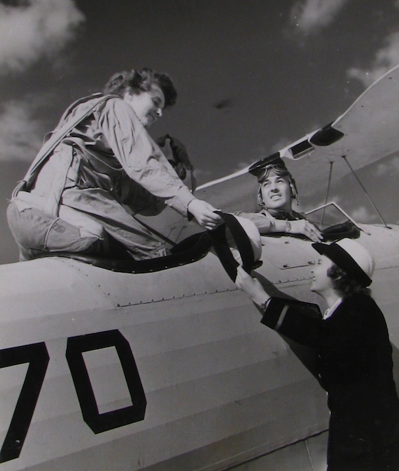 WAVE Ensign Mary McLean steps into the cockpit in flight gear while on duty at NAS Squantum, Massachusetts. Looking on are Lt. Leo J. Houle, the pilot, and Ensign Barbara Hunter. Lt. Houle was a former Flying Tiger pilot on the Chinese front.
