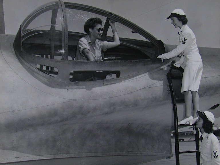 WAVE Gladys McCullough shows 2 visiting WAVES to NAS NOLA how a PRY gun turret works during the station’s open house for the WAVES second anniversary in 1943. It comes from the National Archives.