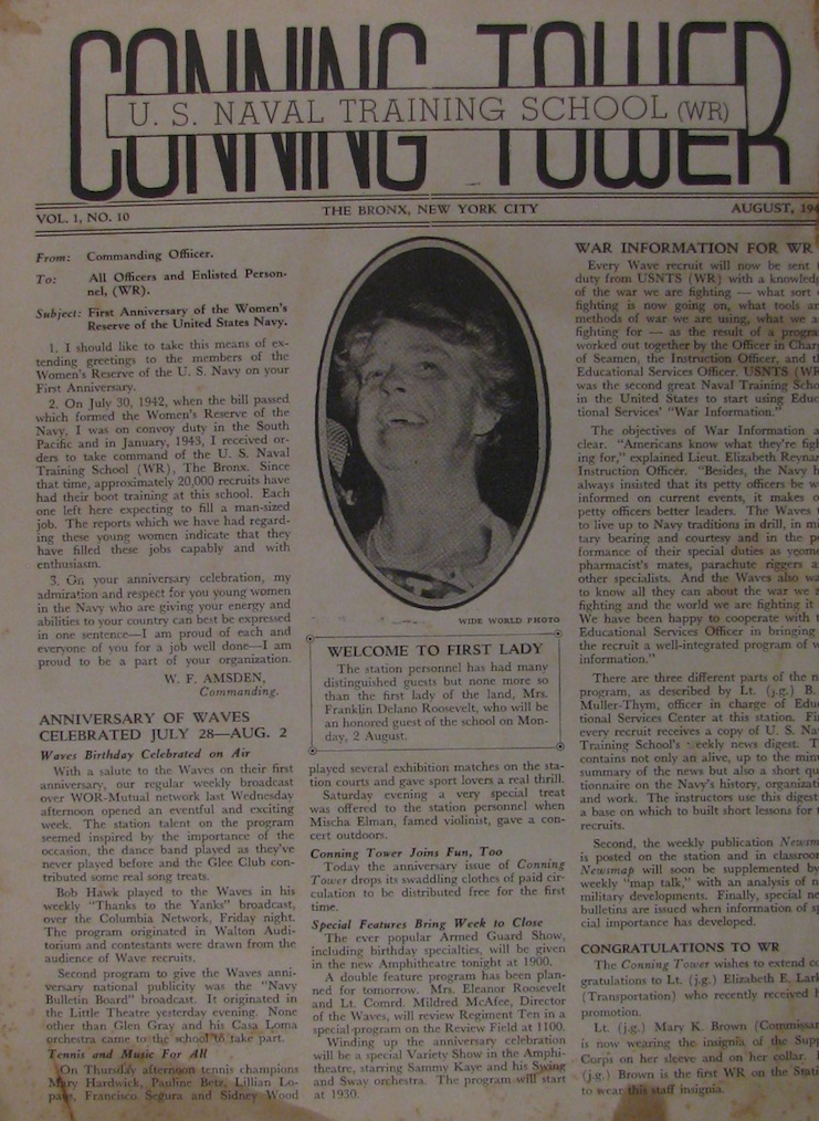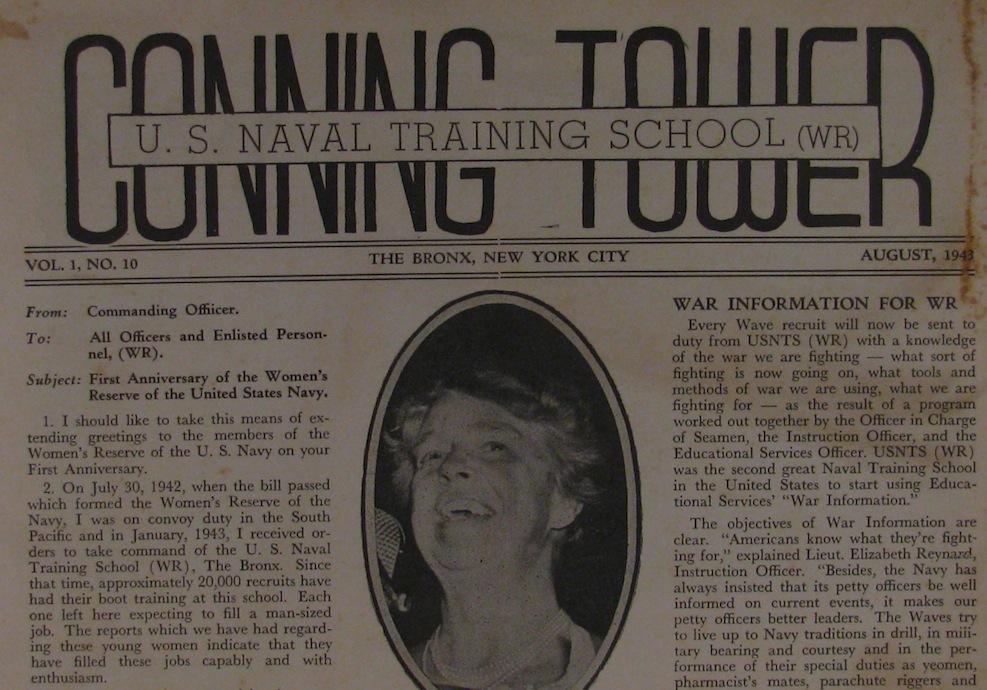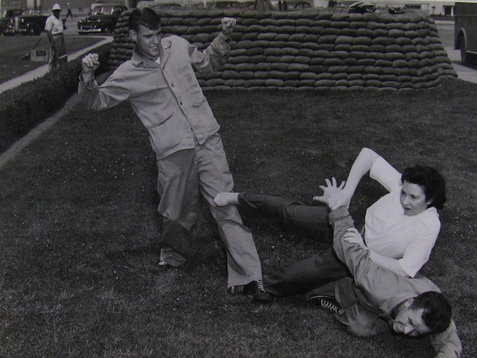 Navy WAVE Naomi Sue Kleinberg Edmond Tofil, US Marine Corps, demonstrate the art of jiu jitsu during a demonstration at the Hunter College boot camp in 1943. She’s using a circle throw against her opponent.