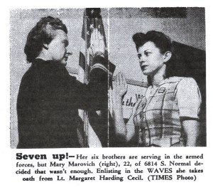 This is a photograph of my (Homefront Heroines Director Kathleen Ryan) mother, Mary Marovich Ryan. It was taken after she enlisted in the WAVES. She came from a large family and grew up on the south side of Chicago. They didn’t have much – it was the Depression and there were a lot of mouths to feed.