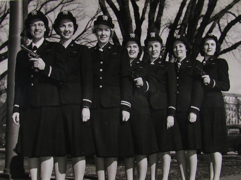 WAVE officers of the Bureau of Ships qualify for the Navy Expert Pistol Medal on the Marine Pistol Range at Quantico. The photograph comes from the National Archives.