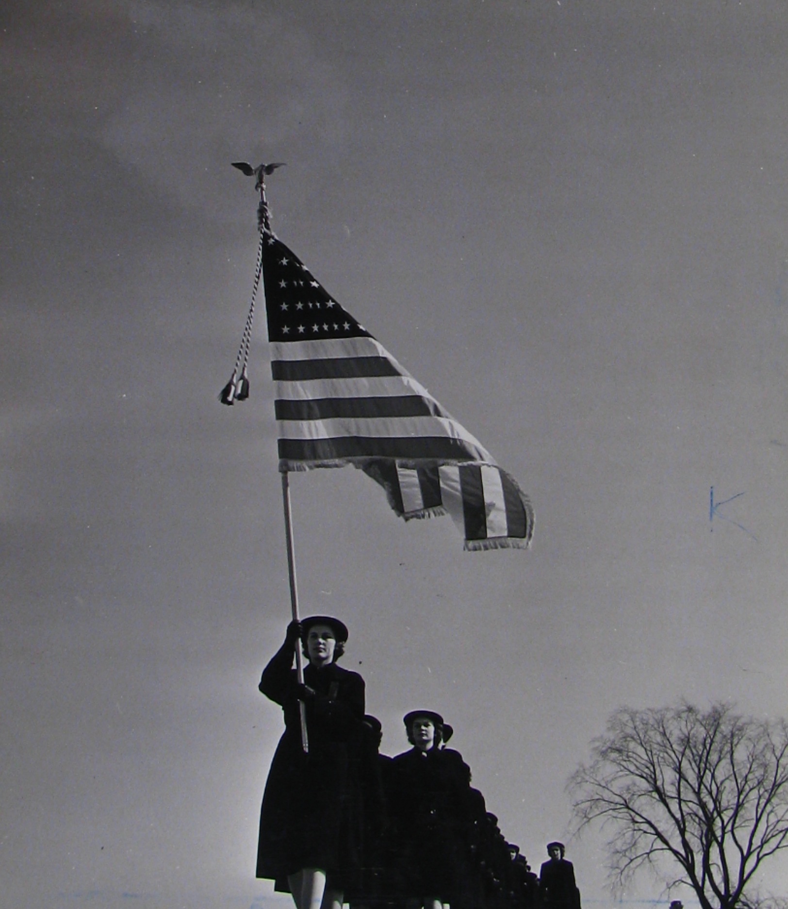 In this photograph from the National Archives, WAVES are marching behind the flag bearer at the Radio School at the University of Wisconsin, Madison.