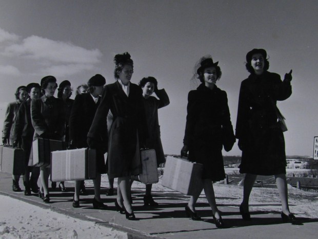 This photo shows women arriving at the Madison, Wisconsin radio training school It comes from the National Archives.