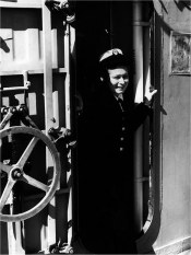 This photograph shows Seaman Recruit Joy Turner in the doorway of a repair ship. In 1978, USS Vulcan became the first U.S. Navy ship other than a hospital ship to have women permanently stationed on board.