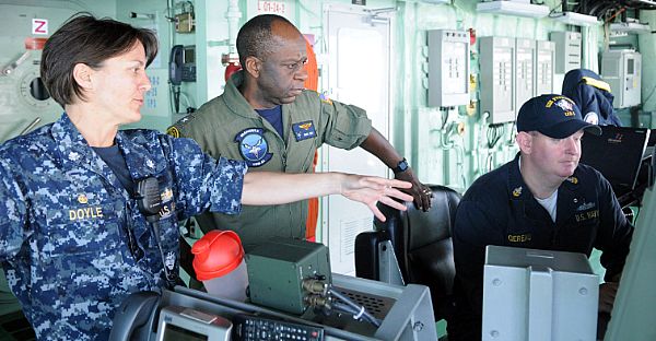 This photograph shows Cmdr. Kris Doyle, commanding officer of the littoral combat ship USS Freedom (LCS 1), explains the readiness control officer console on Freedom’s bridge to Rear Adm. Earl L. Gay. It comes from the U.S. Navy.