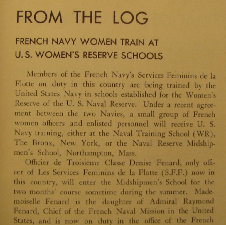 The French Navy’s Feminins de la Flotte began training with US Navy WAVES at Hunter College in June 1944, as noted in this news item from the WAVES Newsletter.
