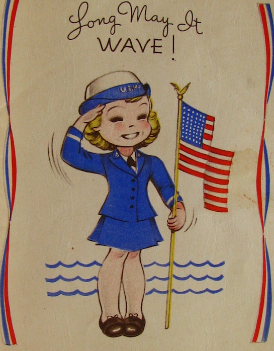 What’s interesting is how many of the cards portray the WAVES. Rather than the young women seen in other illustrations, greeting cards inevitably show the WAVE as a child, with pudgy legs and cheeks and few womanly curves in her figure.