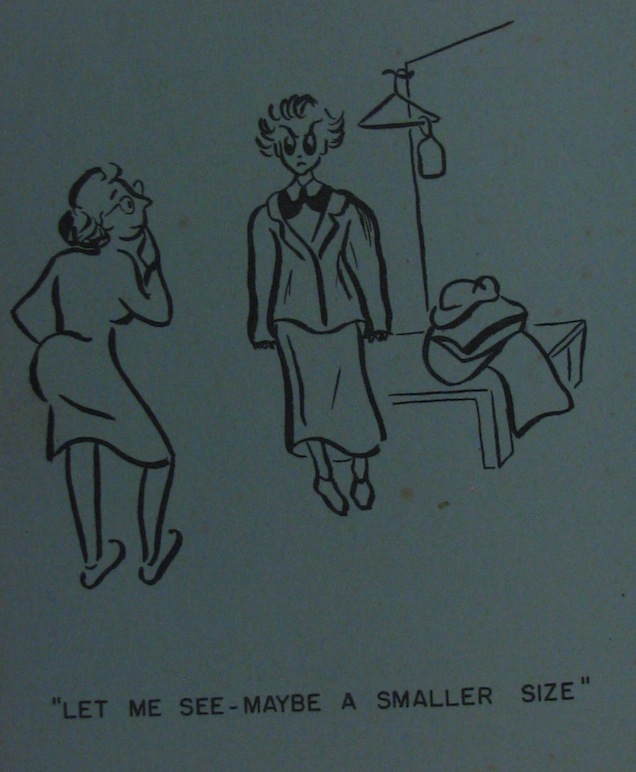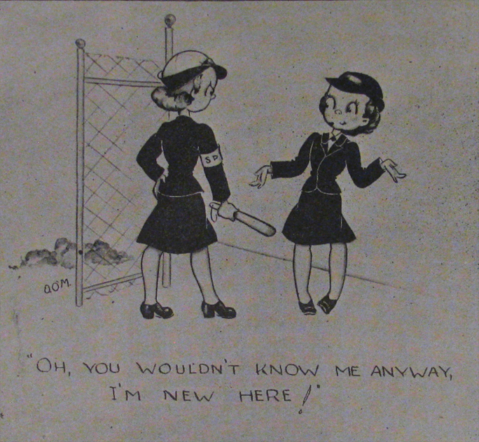 This comic (using a modified version of the “little girl” look seen on WAVES’ greeting cards) pokes fun at the disorientation women felt when entering boot camp. It also offered a pretty clever way of getting out of trouble – the “I’m new” approach.