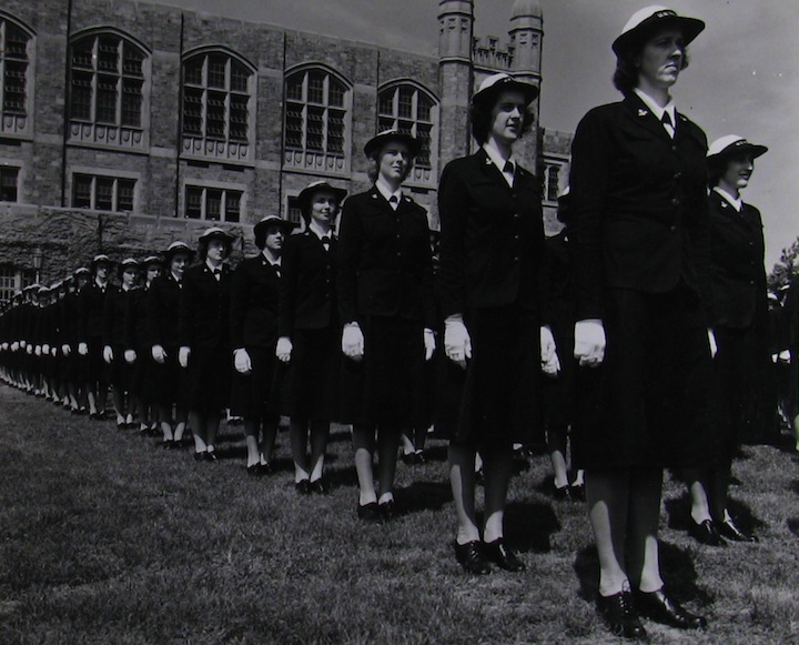 Aviation cadets at NAS St. Louis use the range finder and other gunnery equipment to become skilled marksmen. They’re learning from Navy WAVES, who are showing the fighter pilots how to estimate correct lead time before opening fire on an enemy bomber.