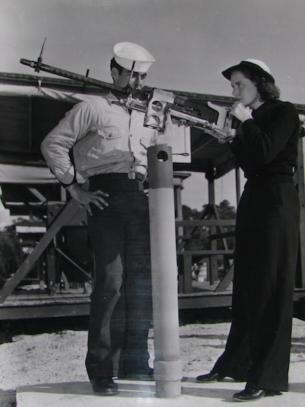A WAVE learns to handle a machine gun at NATC Pensacola, FL where she will later teach male gunners the sights. The photo comes from the National Archives.