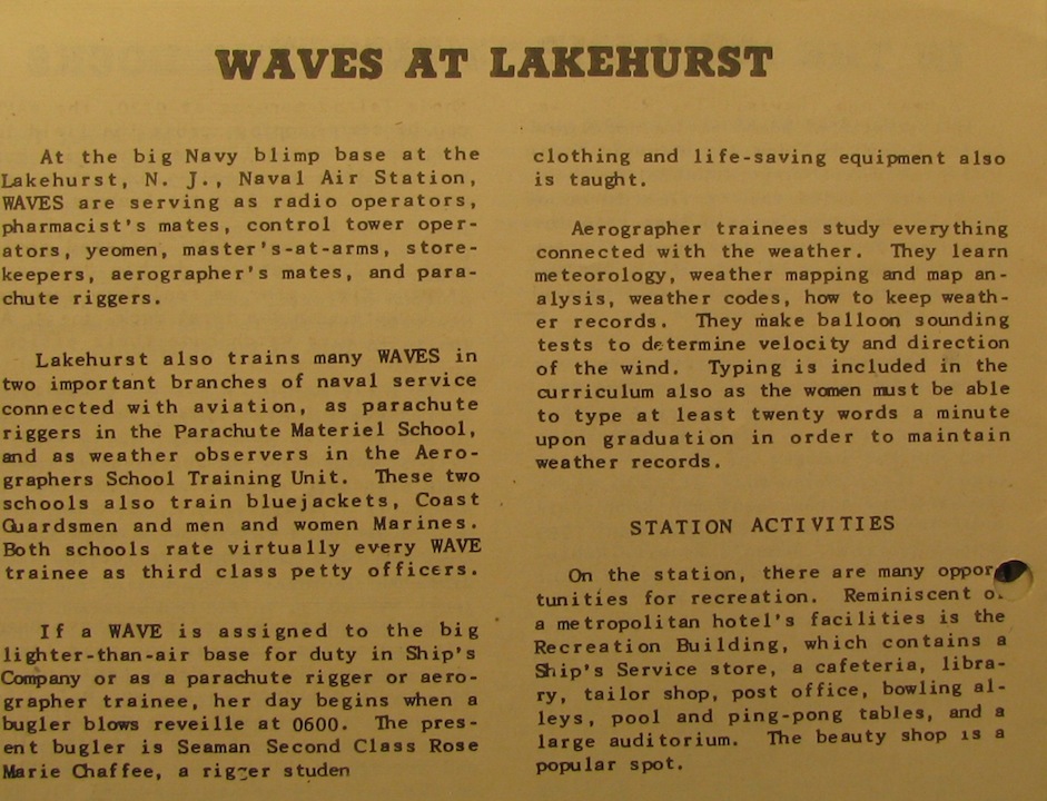 The December 1943 edition of the WAVES News Letter featured profiles of the different bases where the women might be stationed, included Naval Air Station Lakehurst. In Lakehurst, women worked in various aviation-related dutied, including parachute riggers, aerographers, radio operators, control tower operators and other jobs.