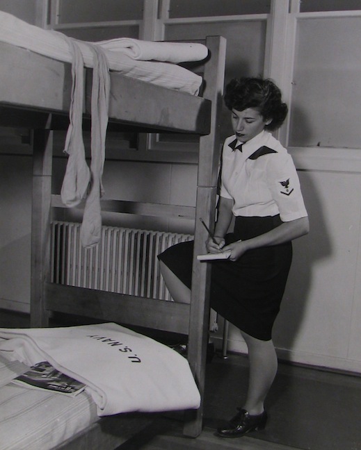 Part of Naval duty is keeping things shipshape. here, WAVE Aspasia Phoutrides, Master at Arms, makes sure the cots are up to snuff in the WAVES barracks in NAS Seattle, Washington in September 1943. WAVES say the blanket at the foot of the bed was known as “the admiral.”
