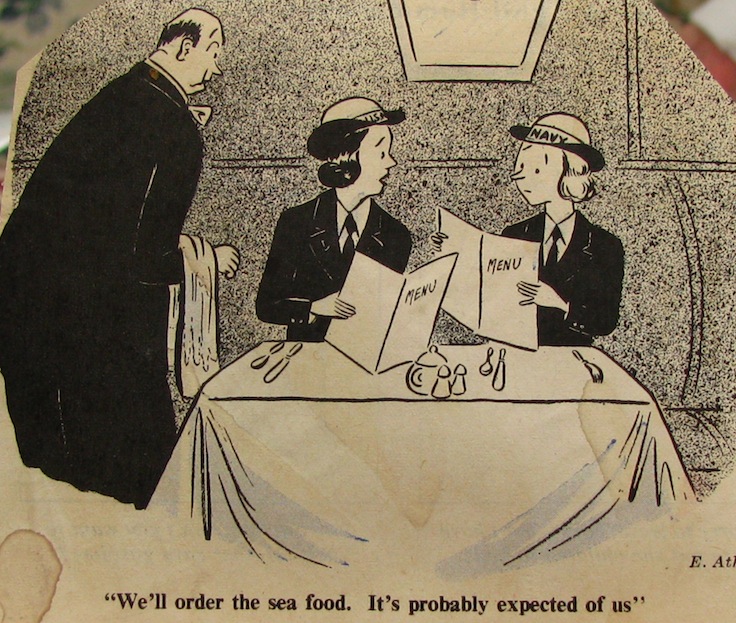 From this November 1943 photograph at NAS Los Alamitos: Chow time affords the girls an opportunity to catch up on conversation and review the work of the day.